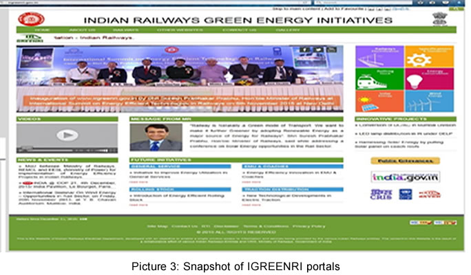 technologies adopted by railways across other countries and also to emphasize on energy management system in zonal railways and the IRGREENRI portal has been developed by Centre for Railway Information Systems (CRIS) to disseminate the green initiatives adopted across Railways (picture 3).