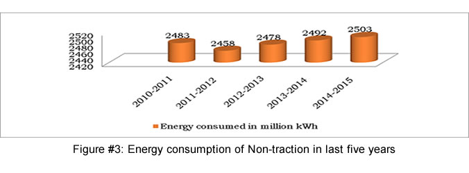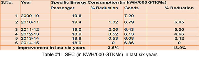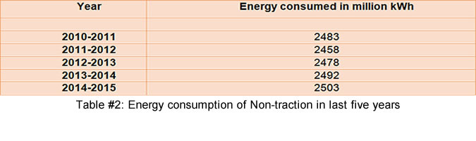 The improvement of specific energy consumption in traction segment in last six years of Indian Railways is given in table #1 below and the energy consumption in non-traction in last five years is given